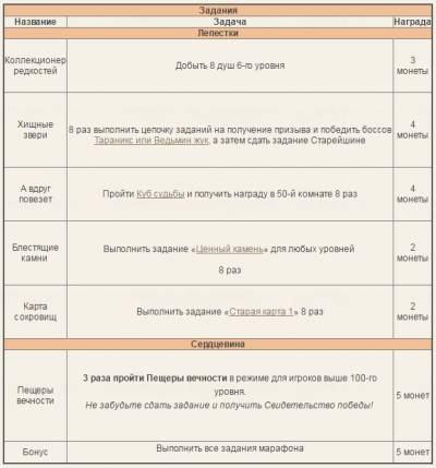 Испытания на этот раз не привязаны к четким датам, поэтому вы можете выполнять задания неограниченное количество раз в удобное для вас время. Но в марафоне есть своя «изюминка». Сначала вам предстоит сорвать пять лепестков ромашки, выполнив задания «Коллекционер редкостей, «Хищные звери», «А вдруг повезет», «Блестящие камни» и «Карта сокровищ». Только после этого вам станет доступна сердцевина цветка и испытание «Пещеры вечности».